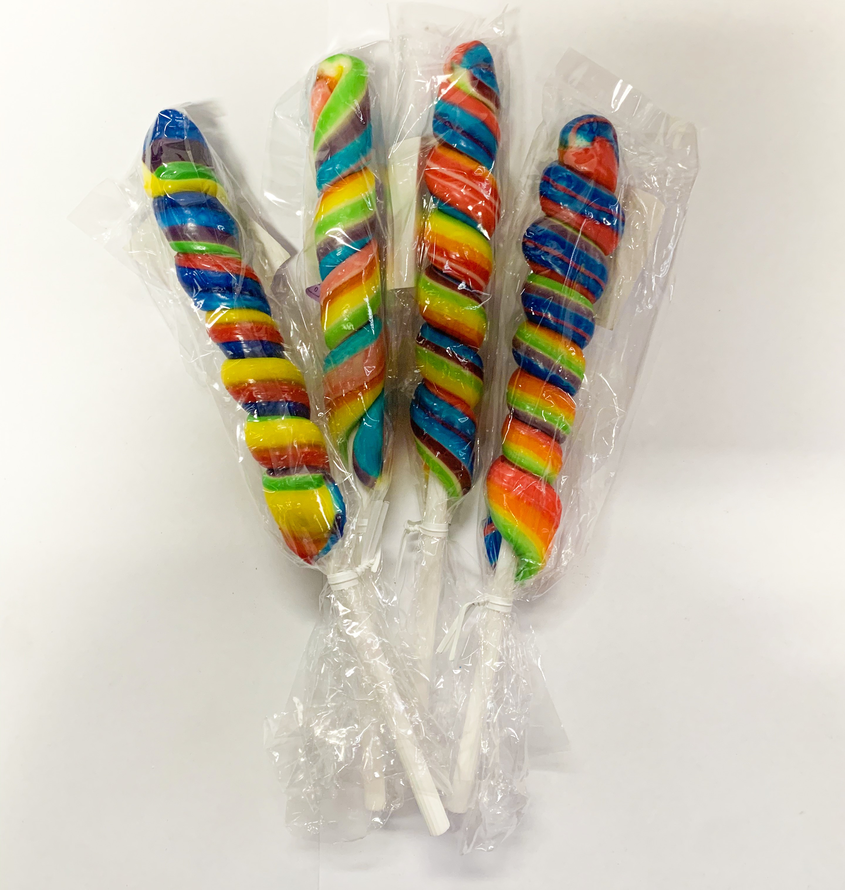 A beautiful Rainbow coloured twist lollipops on a stick.