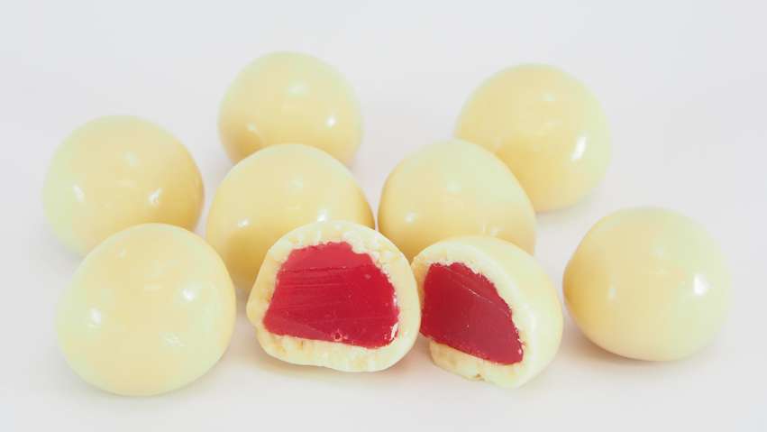 White Chocolate Raspberries Everfresh These ARE delicious. Melt in the mouth milk chocolate and a chewy ripe raspberry lolly – a perfect combination! Rich creamy colour on the outside and a red raspberry inside.