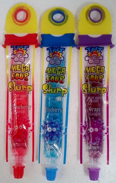 Assorted flavour liquid candy mega sour slurps, perfect for heaps of different occasions! 24 individual slurps in a pack. Each individual slurp contains 23g of liquid candy and measures approx. 4cm x 23cm. Flavours include blueberry, grape and strawberry.  ...Read more