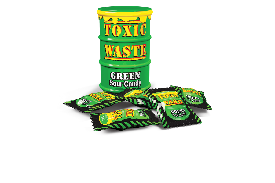 Each container is shaped like an over flowing drum of Toxic Waste and comes packed with an assortment of super  - sour flavours including Lime, Kiwi, Melon, Green Apple, Green Pear.
