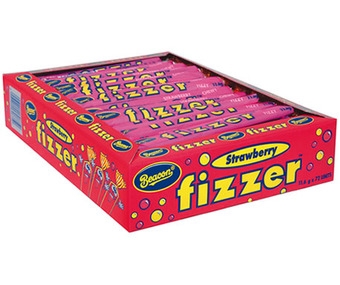 These Fizzers are a strawberry flavoured chewy lolly stick. Each box conatains 72pcs.