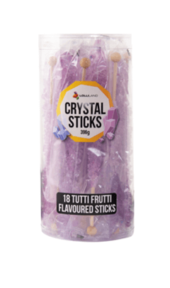 A jar of lavender tutti fruitti flavoured Rock Candy Crystal Lollipops.