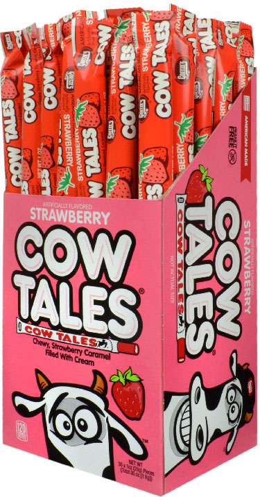 Strawberry cows tales are made of a chewy, strawberry caramel filled with the same delicious, white center as Vanilla Cow Tales.