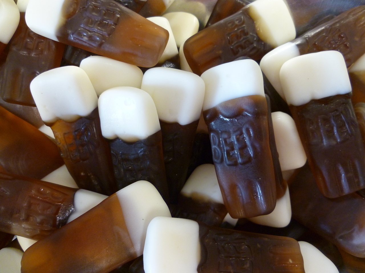 Glucose syrup, sugar, pork gelatine, wheat starch, acid: E330; gelling agent: pectin; flavouring, caramel syrup, colour: E171; vegetable oil (coconut), glazing agents: beeswax, carnauba wax.