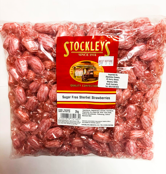 Sugar Free Sherbet strawberry flavoured boiled lollies.