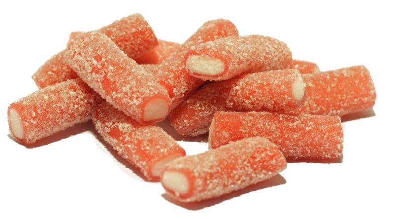 Ingredients; sugar, glucose syrup, invert sugar syrup, whear flour, corn starch, vegetable fat, humectant, (glycerol,) citric acid, potato starch, malic acid, emulsifier, (mono- and di-glycerides of fatty acids) glazing agents, vegetable oil, mono- and- di-glycerides of fatty acids, vegetable fat, flavourings, fruit and vegetable concentrates, (blackcurrant, carrot) colour (cochineal) Contains Gluten and wheat.